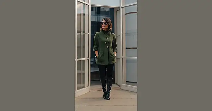 This girl knows how to rock a casual classy look! That green jacket? It’s like the coolest, chicest sweater you’ve ever seen. Forget about boring old jeans and t-shirts – this outfit screams “I’m stylish, comfortable, and ready to take on the world!” And don’t even get me started on those boots – they’re like the cherry on top of a super delicious ice cream sundae.