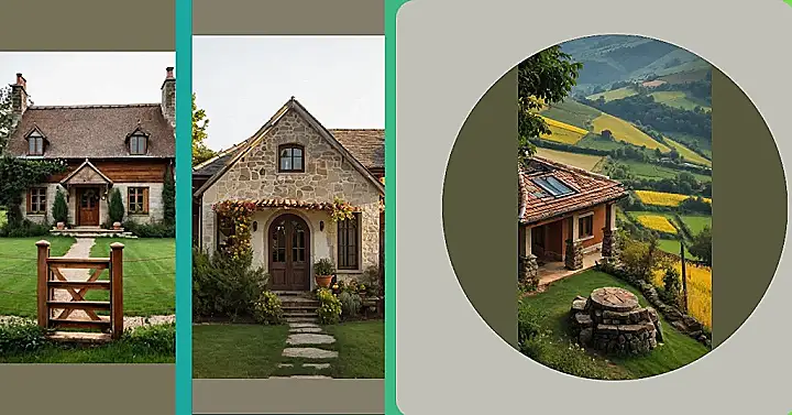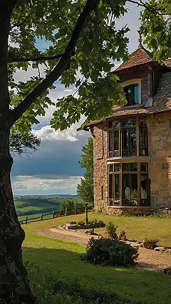 This rural house is like something out of a fairytale! It sits on a hilltop, surrounded by green fields and a big, leafy tree. You can almost imagine the wind whispering through the leaves and the birds singing in the branches. It looks like the perfect place to escape the city and enjoy some peace and quiet.
