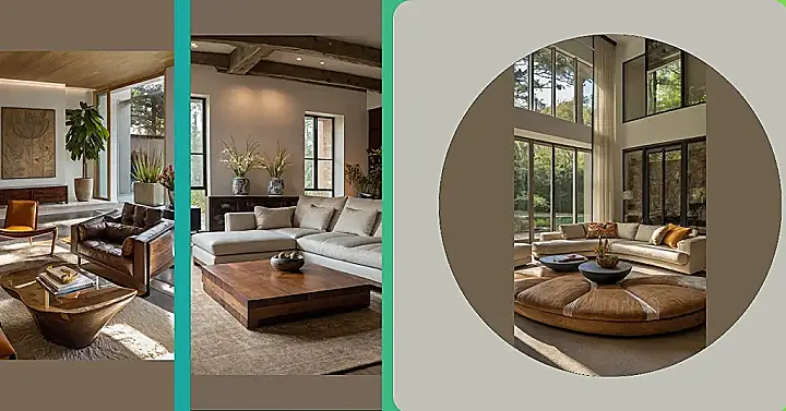 Imagine this: you’re lounging on a giant, comfy brown ottoman, sunshine streaming through massive windows that make the room feel like an outdoor escape. That’s the vibe of this organic modern living room—it’s like nature decided to throw a super stylish party inside! The curved sofa hugs the space, inviting you to sink in with a good book and a cup of something warm. It’s all super comfy and relaxed, but also seriously chic. Who needs a vacation when you have this?