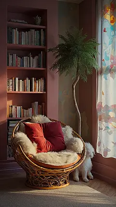 It’s basically a reading superhero’s secret lair disguised as a chill zone. That bookshelf is just begging for you to conquer it, one chapter at a time. You could spend hours lost in a fantasy world, learning about history, or just laughing at a funny story. And let’s be real, that chair looks like it’s giving you a silent invitation to nap afterwards!