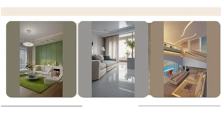 This living room looks like a spaceship! It’s so futuristic and cool, it’s like stepping into a sci-fi movie. The curved ceiling and the sleek, white furniture make it feel like you’re floating in space. And the warm glow of the lighting makes it extra cozy, like a little spaceship hug.
