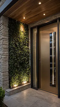 Walking up to this place feels like stepping onto a mini-stage. This main entry is designed to make a splash, with the lights highlighting the leafy bodyguard and the stylish door practically demanding you knock with flair. It’s the ultimate first impression, making sure everyone knows something cool is happening behind that fancy facade. You just hope the plants approve of your visit, otherwise, who knows if they’ll let you through their botanical security check!