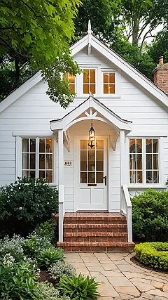 Check out this white cottage, looking all innocent and charming like it just rolled out of a fairy tale. Its exterior is so bright and white, you’d think it survives purely on sunshine and good vibes, definitely not mud puddles or accidental soccer ball dents. The bushes down front are putting on a serious performance, trying to look all neat and tidy, probably whispering gossip about who last tripped on those perfectly stacked brick steps. It honestly looks like it’s posing for a magazine cover, probably titled “Homes That Are Way Prettier Than Yours”.