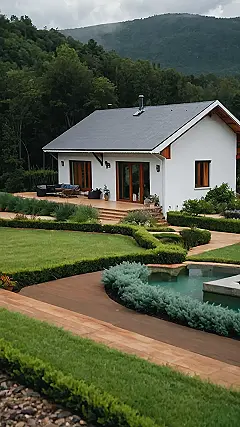 This charming house looks like it’s straight out of a fairytale! It’s nestled among rolling hills and lush greenery, making it feel like a secret hideaway. Imagine waking up to the sound of birds chirping and the smell of fresh air. Maybe you’d even take a little boat ride on the pond out front (which, for some reason, has a boat sitting on the grass… maybe it got lost in the woods!). Either way, it’s a picture-perfect spot to relax and enjoy life.