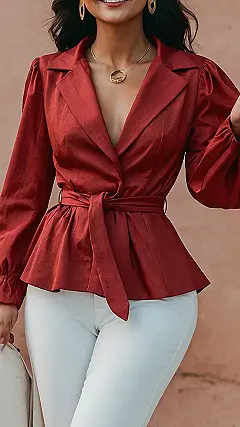 This outfit is definitely red hot! The woman in the picture is rocking a bold, red top that looks super stylish. The top has a cool, almost blazer-like style with puffed sleeves, but it’s cinched in at the waist with a matching tie. It’s like a classic look with a trendy twist! It’s also super flattering because it shows off her awesome figure. And hey, who doesn’t love a little bit of red to make a statement?