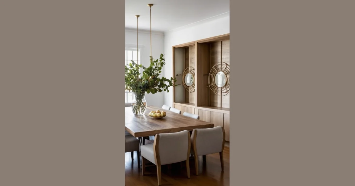 So, you’re thinking about sprucing up your dining room, huh? Well, check out this place! They’ve got this cool wood feature behind the table that’s not quite a wall, not quite art, but definitely eye-catching. It’s like they couldn’t decide between a forest and a room divider, so they just jammed them together. And the glass table means that when you accidentally drop your fork, at least you can still see it on the floor!