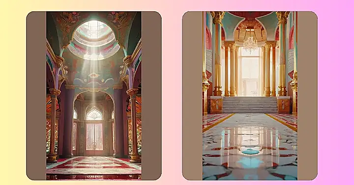 Imagine hanging this up in your bedroom – instant royalty! With all those golden columns and sparkly chandeliers, you could practically charge admission to your friends. Just make sure you have some fancy snacks on hand, like maybe gold-dusted chips or diamond-shaped cookies, to really sell the “palace life” vibe. No one needs to know you’re still rocking that beanbag chair under the chandelier!