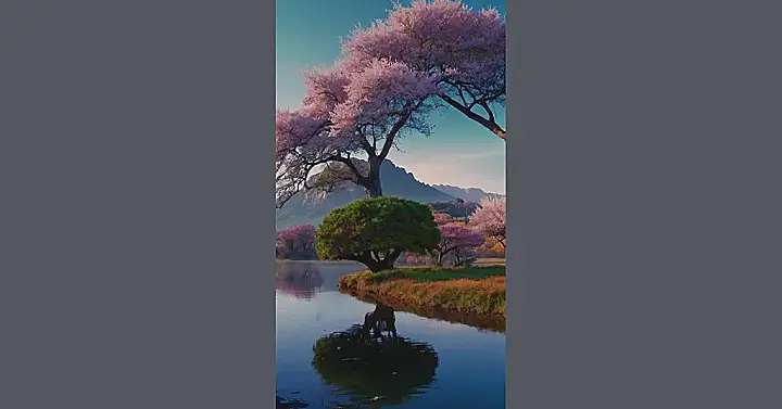 Imagine a world where the sky is painted with the softest shades of blue, and fluffy pink clouds dance across the canvas. Now add a bunch of trees, all in various shades of pink and green, surrounding a crystal-clear river. This is no ordinary scene, it’s a breathtaking reflection of nature’s beauty! The trees are like giant, graceful ballerinas, dipping their branches into the water as if taking a sip of the sky. The water acts like a mirror, reflecting the beauty of the trees back up, making the whole scene feel like a double dose of awesome!