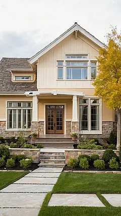 So, you’re dreaming about your perfect house, huh? Well, check this place out! It’s like a video game level where you have to walk down this awesome stone path, past perfectly trimmed hedges and climb these cool steps. And boom, you’ve unlocked the main door! It looks like the kind of house where, inside, everything’s always spotless and you can totally imagine having epic movie nights with your friends!
