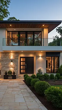 So, you’re dreaming about your perfect house, huh? Well, check this place out! It’s like a video game level where you have to walk down this awesome stone path, past perfectly trimmed hedges and climb these cool steps. And boom, you’ve unlocked the main door! It looks like the kind of house where, inside, everything’s always spotless and you can totally imagine having epic movie nights with your friends!