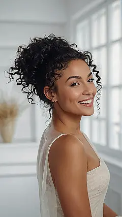 This picture shows a woman with beautiful, bouncy curls, and she’s totally rocking them! It’s like her hair has a life of its own, just bouncing and twirling around her face. She’s got her curls pulled back in a cute little bun, but even then, you can see how full of personality her hair is. You can tell this girl is embracing her natural curls, and honestly, she looks super confident and ready to take on the world!