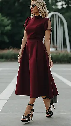 This outfit is like the perfect mix of a fancy dinner party and hanging out with your besties at the mall. It’s got that classic, put-together vibe, but it’s not too stuffy. The deep red color is super chic and the flowy skirt makes you feel like you’re ready to take on the world, but in a comfy way. Plus, the sparkly belt adds just the right touch of bling!