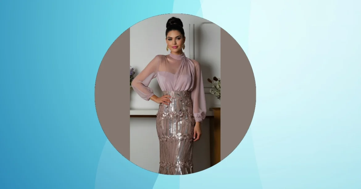 This outfit is like a spring garden party decided to crash a fancy restaurant! The sheer sleeves say “I’m breezy and fun,” while the sparkly skirt shouts “Look at me, I’m sophisticated!”. It’s the perfect balance for a spring dinner where you want to impress, but also let everyone know you’re not afraid to have a good time. Just try not to accidentally blind anyone with that glitter – you might need to wear sunglasses indoors too.