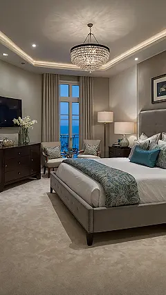And seriously, check out that bed! It looks so plush and huge, you could probably get lost in the covers and not resurface until noon. Plus, that sparkly light hanging from the ceiling? It’s giving major fancy vibes, like you need to wear a tiny crown just to lie down. With a view like that outside the window and those comfy chairs, you could totally pretend you’re on vacation, even if you just finished arguing with your alarm clock this morning.