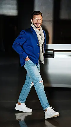This guy’s totally rocking the “mens jeans outfit” look, right? He’s got dark jeans – classic and always cool – paired with a comfy-looking, stylish sweater. See how the sweater’s got two tones? It’s like a subtle “I woke up like this, but actually I put a lot of thought into this” kind of vibe. And those white sneakers? Perfect for keeping it casual but still super sharp. He’s basically saying, “I’m comfortable, I’m confident, and I’m ready to take on the world – one stylish step at a time.” The sunglasses are a nice touch, adding a bit of mystery and a whole lot of cool.