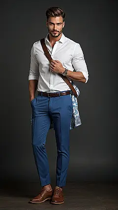 This guy in the photo totally gets the smart casual mission. He looks put-together, but not like he’s heading to a fancy ball. It’s the ultimate move for when you want to look good without feeling stiff, like your shirt is whispering “I’m important,” but your pants are shouting “but I can still eat pizza!” That crisp white shirt with the blue pants and cool brown shoes? It’s basically the uniform for looking effortlessly cool at anything that isn’t school or a formal wedding. Plus, that jacket slung over the shoulder just adds a touch of “I’m too cool for this weather… maybe.”