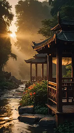 This picture is like a scene straight out of a fairytale! Imagine waking up to this view – a beautiful morning with a gentle mist floating over a peaceful stream, sunlight peeking through the trees, and a charming little wooden pavilion waiting for you to enjoy a cup of tea. The mist swirling around the pavilion looks like magic, making the whole scene feel super dreamy.