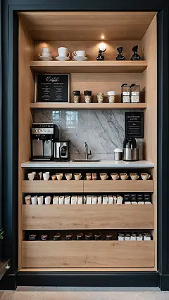 Seriously, having a coffee bar like the one in the picture just makes life cooler. Forget messy counters; this thing has everything you need tucked away but totally accessible. You can grab a perfect cup, choose your favorite flavour pod, and maybe even find a little snack like those bits in the jars. It’s way more fun than digging through cupboards, and it basically screams, “Yes, I take my beverage game very, very seriously… or I just really like having all my stuff together.”