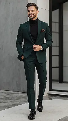 Putting on a formal suit like this cool green one feels kind of like unlocking a secret level in your style game. Suddenly, your regular clothes feel like ‘practice mode,’ and boom! You’re in ‘expert mode,’ looking ready for anything from a fancy event to just walking down the street looking sharp. Adding a slick black turtleneck instead of a boring shirt and tie gives it an extra boost, making you look effortlessly cool and like you definitely didn’t just roll out of bed five minutes ago. It’s like transforming into your own personal suave character.
