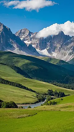 The picture shows a scene straight out of a storybook! You can almost hear the birds singing and the wind whispering through the trees. The majestic mountains tower over the valley below, their peaks covered in snow and a few fluffy white clouds. They’re like giants sleeping peacefully, dreaming of the next adventure. You might even think they’re holding their breath, trying not to disturb the quiet river snaking its way through the green, grassy landscape. It’s a place where you could spend hours simply relaxing and soaking in the beauty of nature, feeling small but happy, like a tiny bug enjoying the shade of a massive oak tree.