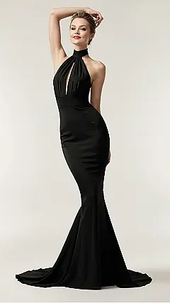 **Paragraph 1:** Whoa, check out this dress! It’s like something straight out of a glamorous movie. That sleek, black fabric looks super smooth and luxurious – like liquid midnight. The halter neck and that stunning mermaid tail are seriously next-level chic. Imagine yourself gliding across a dance floor in this bad boy – you’d totally outshine everyone! It’s the perfect blend of classic elegance and modern wow-factor. It’s a “classic silk dress” that screams sophistication, even if you’re just heading to the pizza place with friends.