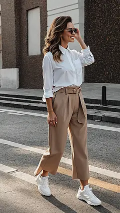Check out this outfit! It’s got that classic white button-down shirt tucked into some seriously cool wide-leg pants. You know, the kind of look that makes you feel instantly like you could conquer the world, or at least nail that presentation without tripping. It’s like the shirt is doing half the work, yelling “I’m here, I’m chic, and I probably got enough sleep last night!” Even though the woman in the picture looks totally effortless, we all know it takes a little bit of magic to get that perfect tuck just right.