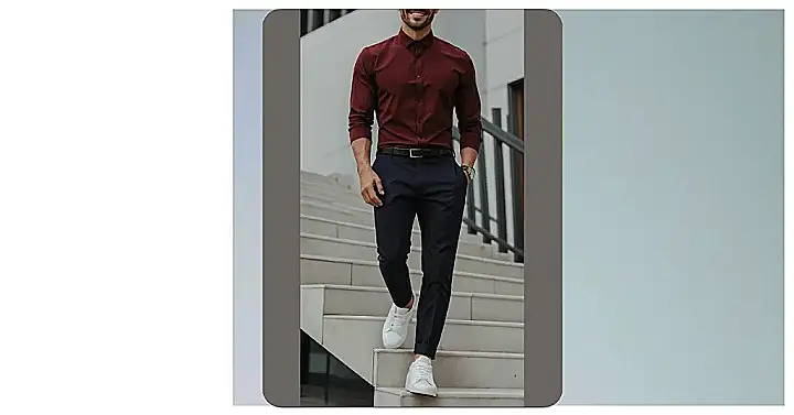 Check out this guy! He looks like he’s on a mission, maybe heading to a super important meeting or just showing off his cool maroon shirt. He’s got that business vibe going with the sleek belt and smart pants, looking totally ready to conquer something. But wait, are those… sneakers? Yep! It’s like his upper body is saying “I’m a professional adult!” while his feet are whispering “Psst, let’s run away and get pizza later!” He’s definitely pulling off the look that says, “I mean business, but my feet are on vacation.”
