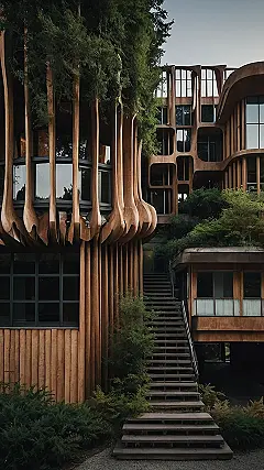 This style of architecture is called “organic architecture,” which means that the buildings are designed to look and feel like they are part of nature. You can tell it’s organic because it has all these interesting shapes and textures, and it blends in really well with the trees and plants around it. Imagine having a school that looks like a giant, cozy treehouse! You could study in the branches and have your lunch in the leaves! This building is definitely a cool example of how nature and architecture can come together.