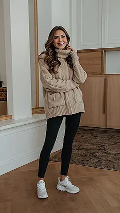This outfit is like a warm hug on a chilly day. The chunky knit sweater is so soft and comfy, it’s like wearing a cloud! The black leggings add a touch of sleekness, and the white sneakers are perfect for running errands or grabbing coffee with friends. It’s the perfect balance of comfort and style, so you can stay cozy and look amazing all winter long!