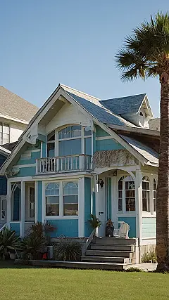 This beach house is practically begging for a summer vacation. It’s got that classic beachy vibe with its light blue walls and white trim, but it’s also a little bit quirky with its unique shape and palm tree out front. It looks like the kind of place where you could kick back, relax, and maybe even forget to put on sunscreen!