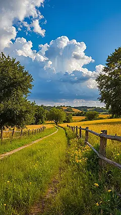Check out that sky! Those clouds are putting on a whole dramatic show, looking like giant fluffy monsters about to unleash some sunshine or maybe just a quick sprinkle to mess up your hair. That old wooden fence looks like it’s been standing guard forever, probably sharing secrets with the tall grass and bright yellow flowers. Capturing these simple but stunning scenes is what rural photography is all about – finding the cool details in nature’s messy backyard and somehow making it look like a postcard without getting mud on your shoes.