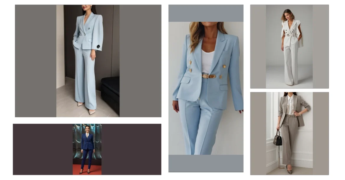 This image shows a woman rocking a seriously stylish baby blue suit! It’s not your grandma’s boring beige – this is power dressing in pastel perfection. Those gold buttons are like little bursts of sunshine, adding a touch of fun to a classic look. Imagine walking into a meeting feeling this confident – you’d totally nail that presentation, ace that exam, or even just impress your friends with your amazing fashion sense. The suit is sharp, but the color keeps it fresh and modern – kind of like a superhero in disguise (but way more stylish, of course!).