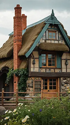 This cute cottage is like something straight out of a fairy tale! The thatched roof and stone walls make it look like a cozy haven for gnomes and fairies. The stone path leading up to the front door seems to be whispering about secret adventures waiting to be found. Just imagine, maybe it leads to a hidden forest or a magical garden where talking animals and kind witches live.