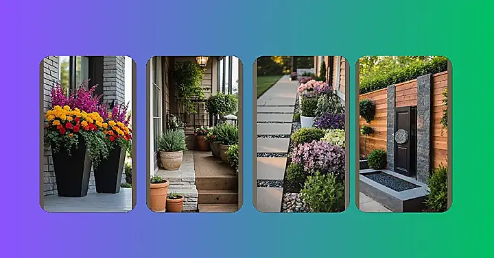 Think of planters as adding stylish accessories to your house, just like you would for an outfit, but these ones are way easier to deal with than finding matching socks. Look at all the different greens, pinks, purples, and yellows in that image! Planters let you play around with different plants and colours right by the door, creating your own little welcome party for anyone who visits (or just walks by and gets a little jealous). Plus, if a plant decides it’s had enough drama and wants to retire, it’s simple to swap it out without needing a whole excavation project. It’s decorating with plants, made easy and totally fun!