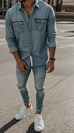 Check out this guy rocking the perfect men streetwear jeans look! These aren’t your grandpa’s stiff denim; these light blue beauties come with strategically placed holes that scream “I’m effortlessly cool” instead of “my washing machine ate my pants.” It’s like they survived a totally rad adventure, even if that adventure was just walking to the corner store. Getting the right fit in ripped jeans is key to nailing this chill vibe and making sure you look more stylish trendsetter and less accidentally fell into a bush.