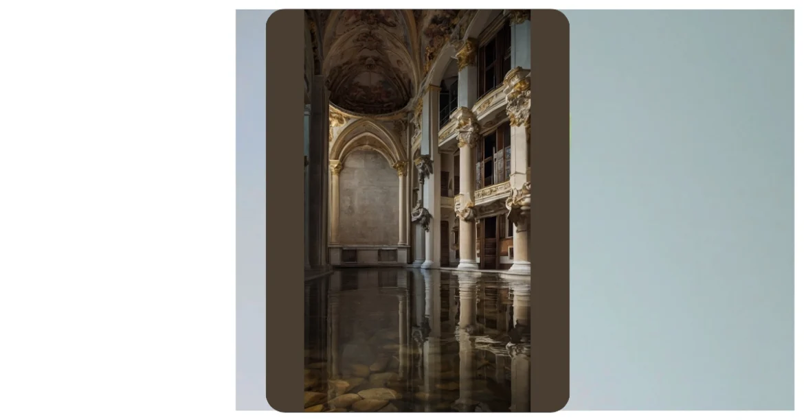 This picture shows a grand hall built in the baroque style, which means it’s super fancy and full of fancy stuff like columns and curved ceilings. It’s so fancy, you might even think it’s a palace! But something’s a little off… The floor is flooded, and all those fancy pillars are reflecting in the water. It looks like someone turned on the sprinklers in this historical building!