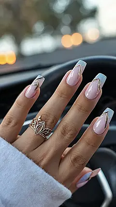These nails are like a fancy French manicure that went to a royal ball! They’ve got a sweet pink base, with a glittery blue tip that looks like a princess’s dress. And get this, they’ve even got tiny gold swirls on them, like a super fancy crown on their tips! You could probably get away with wearing these to a fancy party, but maybe don’t grab the steering wheel with them because those gold swirls are way too delicate to get scratched up.