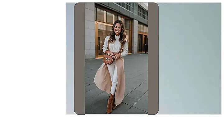 This outfit is totally giving us major fall vibes! Imagine strolling through crunchy leaves in this comfy camel coat and cute white sweater, while showing off your awesome ripped denim shorts. And those white boots? They’re like the perfect finishing touch, adding a touch of sophistication to the whole look. It’s like the perfect outfit for running errands, meeting friends, or even just hanging out at home.