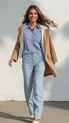 **Paragraph 1:** Hey there, fashion-forward friend! Picture this: it’s a crisp autumn day, the leaves are turning gorgeous shades of orange and red, and you’re headed to a delicious fall brunch. This outfit is your total game-changer! That dreamy camel-colored coat is like a warm hug for your style, ready to keep you toasty while you sip pumpkin spice lattes (or whatever delicious brunch drink you prefer!). The light blue jeans and button-down shirt? They’re the perfect balance of casual cool and put-together chic. It’s effortless style that’s ready for pumpkin pie and good conversation.