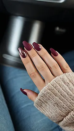 These nails are seriously giving us major fall vibes! The deep burgundy color is perfect for cozying up with a pumpkin spice latte and watching the leaves change color. And the sparkly accent nail? It’s like a little bit of magic sprinkled on top. We can’t decide if it’s the sophisticated wine color, the glittery touch, or the soft sweater that’s making us want to trade in our flip-flops for boots. But one thing’s for sure, this look is totally rocking the fall nail trend!
