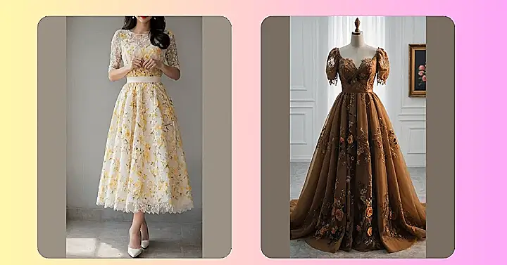 Look at that dress! It’s basically a wearable bouquet of sunshine and fancy lace. You could totally float into a room wearing this and make everyone stop and stare, probably wondering if you just arrived from a secret garden party. Those sleeves are like little works of art, and the way the skirt flows? Definitely gives off main character vibes. It’s the kind of design that makes you think, “Okay, maybe dressing up is kind of fun,” even if your usual style involves maximum comfort and minimal effort.