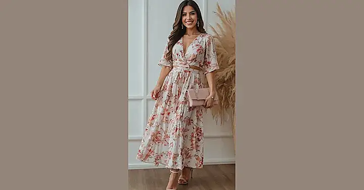 This dress is like a walk through a Parisian garden! It’s got those lovely floral patterns that scream “bonjour” and the flowing skirt is perfect for twirling around the Champs-Élysées. And don’t even get me started on those cute sandals! They’re just the finishing touch for a look that’s as stylish as a French café.