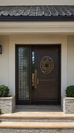 Look at this door! It’s not just any door; it’s the *main* entry, basically the V.I.P. gatekeeper for this house. It looks super solid, like it could withstand a zombie apocalypse or at least an unexpected visit from your aunt Mildred. With its fancy gold circle design and sleek wood, it’s basically saying, “Welcome, but please wipe your feet, and maybe bring snacks.” It stands there, silently judging everyone who dares to ring the doorbell, holding back the secrets of what’s really happening inside – could be epic dance parties, intense video game sessions, or just someone trying to avoid doing the dishes.