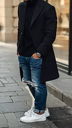 This guy’s rocking a seriously cool Christmas outfit! Forget the cheesy Santa sweaters – this look is all about effortless style. A sleek black coat keeps things sophisticated, while the ripped jeans add a touch of casual rebellion. It’s like he’s ready to conquer the holiday shopping malls, or maybe just impress someone special with his fashion-forward festive flair. White sneakers? Genius move – they keep the whole outfit from feeling too stuffy. Definitely a look that screams “Merry Christmas, and I’m totally awesome.”