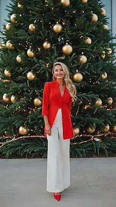 This outfit is pure holiday magic! Imagine yourself, looking absolutely stunning in a vibrant red blazer and crisp white pants, ready to conquer any holiday gathering. You’ll be the most stylish elf at the party, and the Christmas tree itself will be jealous of your glow. Seriously, that red blazer is like a Christmas candy cane come to life! It’s festive, it’s chic, and it’s guaranteed to make heads turn. Plus, those red shoes? They’re the cherry on top of this amazing holiday sundae!