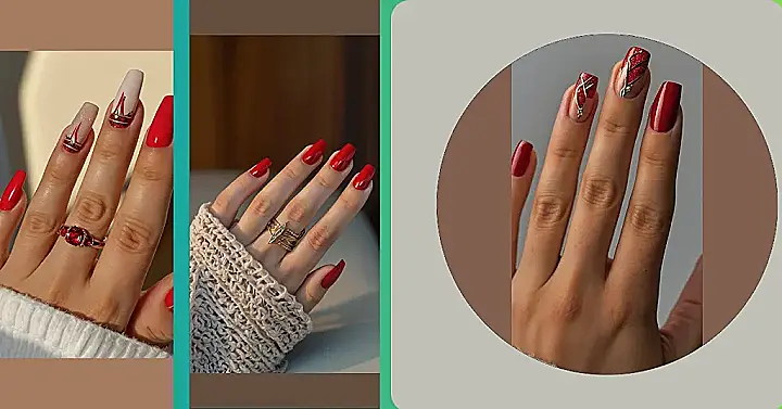 Seriously, check out these designs! You’ve got the classic, striking red ones that are just begging for compliments, but then there are the ones that are basically tiny works of art. That nail with the cool wavy red line on a nude base? It looks like a little abstract painting that belongs in a gallery, or maybe just really likes flowing in the spring breeze. And that geometric one with the gold sparkle? It’s so fancy and unique, it might be plotting world domination, or at least planning the ultimate spring break trip. Your nails will definitely be the most interesting things at the party!