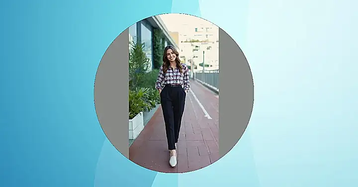 This girl knows how to rock a pair of trousers! They’re not your average jeans, they’re like a sophisticated pair of pants that just scream “I’m confident and ready to take on the world.” That plaid shirt is a cool touch too, like she’s got her own style and isn’t afraid to show it off. She’s walking down the street with a smile that says, “I’m totally owning this outfit!”