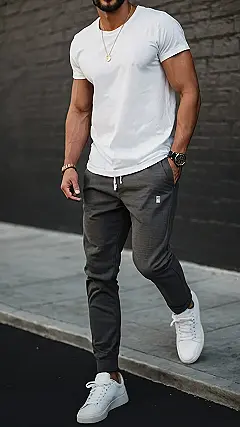 This guy’s got the “I woke up like this” look down pat! A simple grey t-shirt, black joggers, and some clean white sneakers are all you need to rock a casual and cool vibe. It’s like he’s saying, “I’m comfy, I’m stylish, and I’m ready to take on the day!” No need for fancy clothes or complicated outfits. Just a classic look that’s perfect for anything from hanging out with friends to running errands.