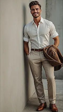 Trying to look sharp at a summer wedding often feels like a competition between looking good and not melting into a puddle. You want to impress without feeling like you’re stuck inside a portable oven. This outfit is basically the superhero of summer wedding style for guys. Sticking to lighter colors like this cool white shirt and those cream pants is like giving your skin a vacation from the sun, keeping you way cooler than trying to rock a heavy dark suit when the temperature’s soaring.