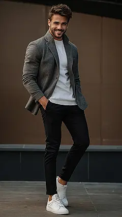 This guy’s got fall fashion figured out! Forget the pumpkin spice lattes, he’s rocking a look that’s way cooler than your average autumn outfit. A comfy grey blazer, a simple white t-shirt, and sleek black pants are the perfect combo for a chill, yet stylish vibe. He’s basically saying, “I’m ready for the crisp air and cozy evenings, but I still want to look effortlessly cool.”